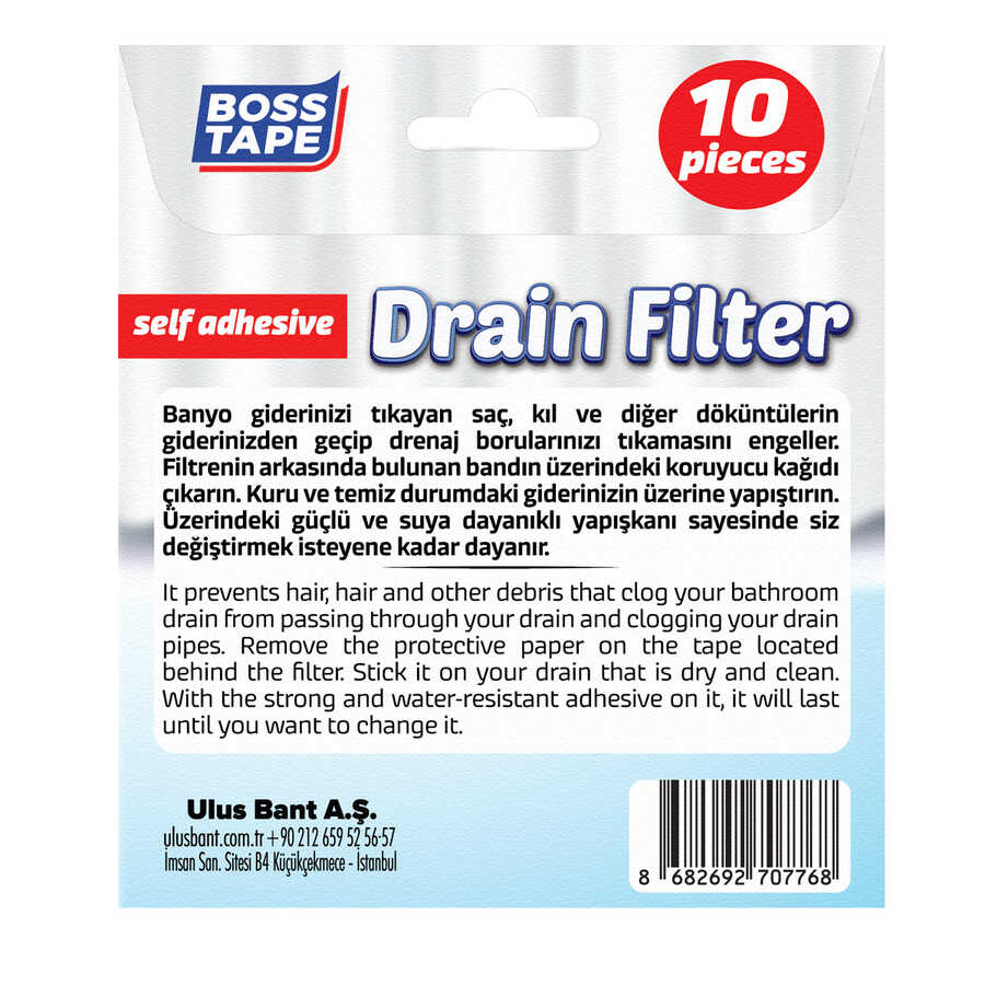 Banyo giderinizi tıkayan saç, kıl ve diğer döküntülerin giderinizden geçip drenaj borularınızı tıkamasını engeller. Paket içerisinde 11x11cm ebadında 10 adet kendinden yapışkanlı filtre bulunur.