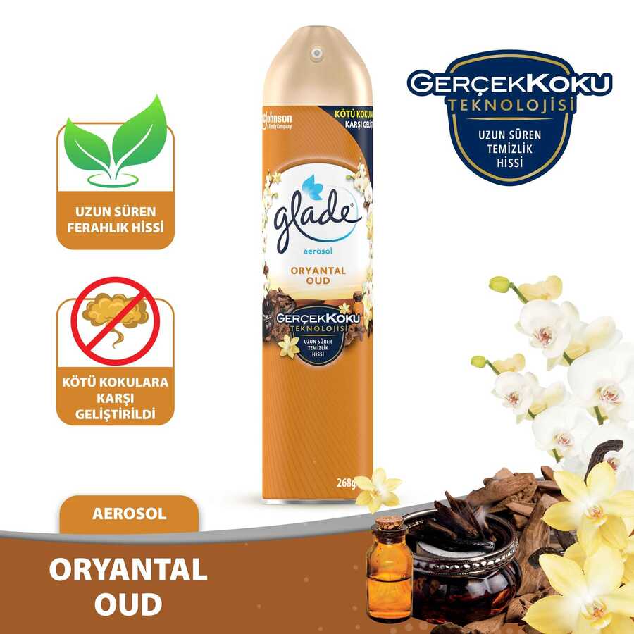 Glade Aerosol Oryantal Oud ile her gününüz çiçek açsın. Evinizin havasına canlılık katarak, her güne taze çiçek kokularıyla başlamanızı sağlar. Özel olarak hazırlanan parfümü sayesinde her püskürtme odanızı anında ferahlatır. Kötü kokulara karşı geliştirilmiş formülü sayesinde evinizin havasını değiştirir. Duyulara hitap eden bu çok katmanlı Sandal Ağacı ve Yasemin kokusuyla her gününüzün çiçek açması ve rahatlatıcı bir spa hissi yaşamanız için Glade Parfüm Ustaları tarafından titizlikle hazırlanmıştır. Glade Aerosol'ü günlük olarak veya rutin ev temizliğinin ardından evinizin havasını ferahlatmak için kullanın.