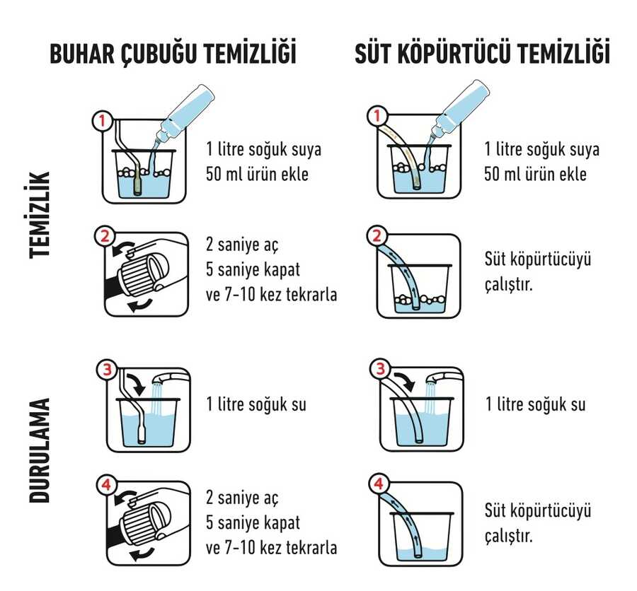 1 lt soğuk suya 50 ml Tretar Milky eklenir. Buhar musluğu 2–3 sn kadar açılır ve ardından 5 sn kadar kapalı bırakılır. Bu işler kirlilik miktarına göre 7–10 kez tekrarlanır. Temizlik işleminden sonra yıkama sürahisine 1 lt soğuk su eklenir, buhar çubuğu daldırılır ve aynı işlem tekrarlanarak durulama yapılır.Köpürtücüler: